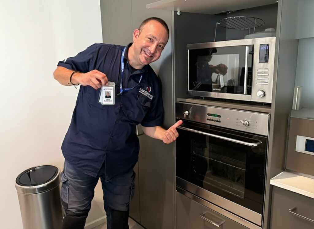 A smiling male appliance technician wearing a dark blue uniform shirt, glasses, and an ID badge stands in a warm wooden kitchen, with his hand resting on the handle of a modern stainless steel built-in oven. An induction cooktop is visible on the countertop, and the kitchen features wooden cabinets and a white tiled backsplash.